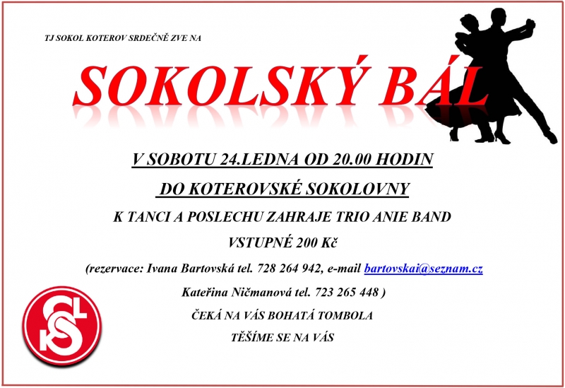 TJ SOKOL KOTEROV VÁS SRDEČNĚ ZVE NA SOKOLSKÝ BÁL, KTERÝ SE KONÁ V SOBOTU 24.LEDNA OD 20.00 HODIN V KOTEROVSKÉ SOKOLOVNĚ.